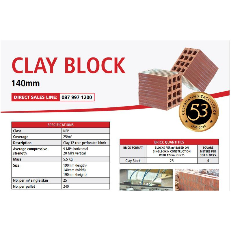 > Building>Bricks & Cement>Bricks, Blocks, Pavers>Clay Block 140mm 25/m2 L:190 W:140 H190mm