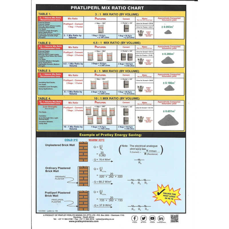 Pre-treated to enable it to mix with ordinary cement for the production of ultra lightweight screeds and plaster Excellent thermal insulator. Stay cool in summer and warm in winter. Just 16mm of Pratliperl plaster doubles the thermal insulation of a two leaf (220mm) external brick wall! Save energy and the environment.