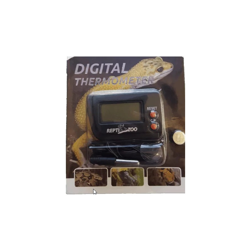 Repti ZooElectronic Digital Thermometer Provides accurate temperature indication,get data quickly. Utilizes high quality imported metal sensing probe. Celsius and Fahrenheit can convertible,it has reset button. Indoor and outdoor temperature detection. Simple to use and aesthetically appealing design.
