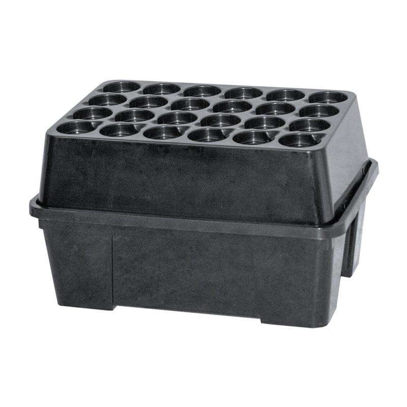 A traditional clone setup requires the lid, tray, and tray inset with holes for Jiffy Pellets. Rooting hormone makes the whole process easier as well as much faster.