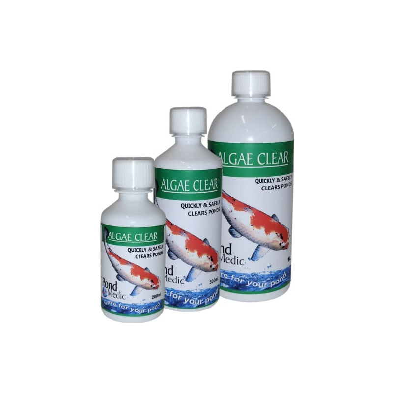 ALGAE CLEAR controls most types of algae in fishponds and prevents them from reappearing. This medication contains no copper or heavy metals and will not affect pond plants or fish when used as directed. Extremely green ponds may experience oxygen depletion after treatment. This is due to dying and decaying algae, so ensure that the pond is well aerated during and after treatment. Algae growth is promoted by high nitrate levels, phosphate from food, fish waste and strong/direct sunlight. Do regular water changes (every 4-6 weeks 20% – 30%) and treat tap water with POND MEDIC ANTI-CHLORINE water conditioner for best results. Use POND MEDIC BIO SPARKLE to separate dead algae from the water.